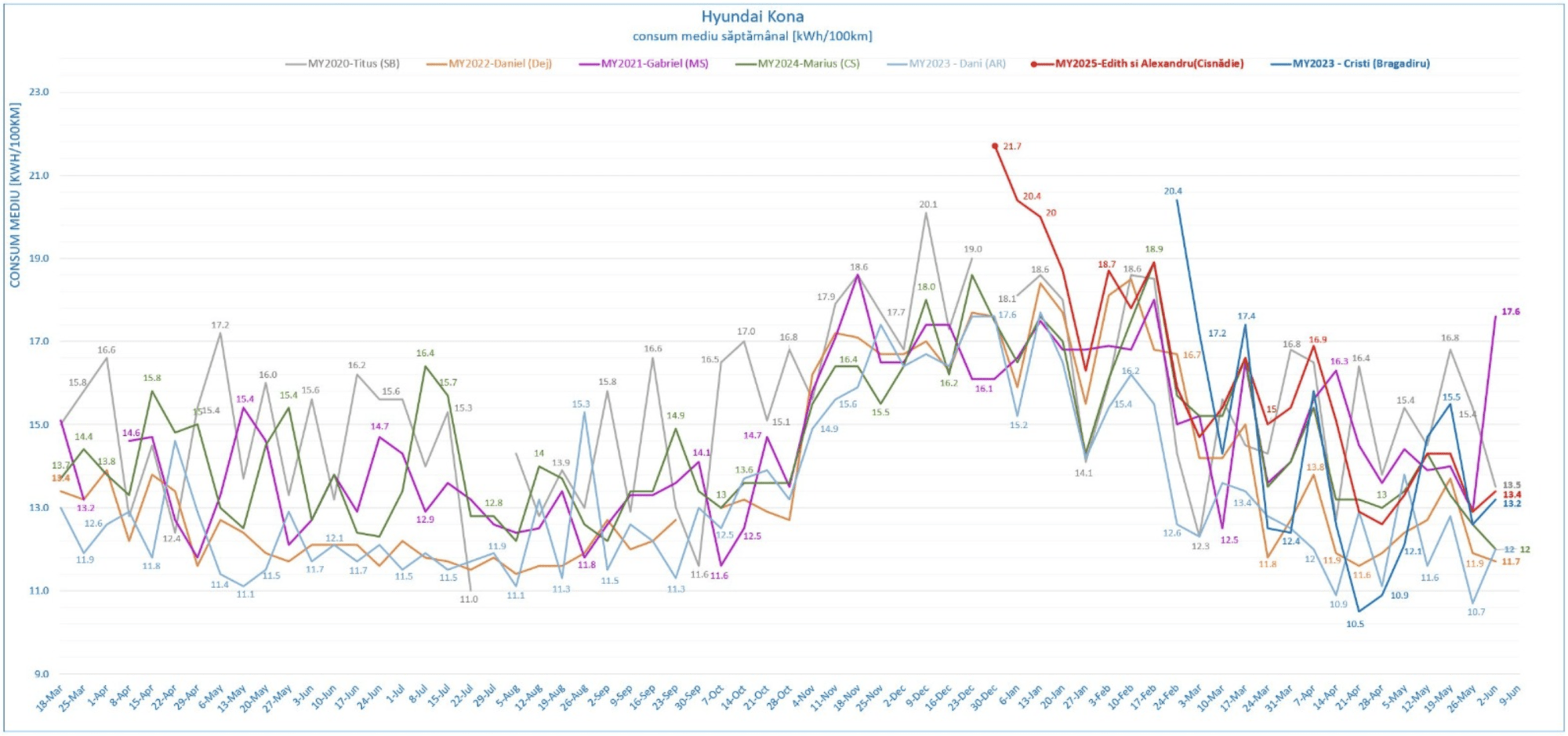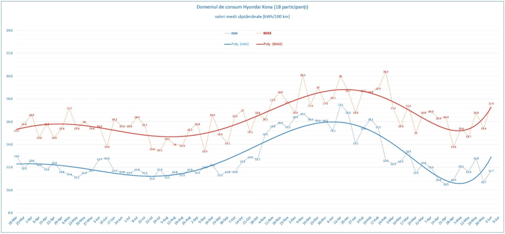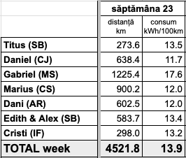 O săptămână cu un parcurs de peste 4.500 km pentru #konițe. Prezența la evenimentul RoBuild a muncit bine Kona lui Gabi (MS), iar consumul realizat cu această ocazie trage în sus și media ponderată a echipei, 13.9 kWh/100 km.