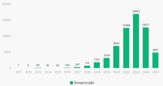 Mă bazez aici pe informații compilate de colegul nostru Tudor (IONIQ 5, TM) în Romanian e-Mobility Index. România a dispus de 16.852 mașini electrice pe parcursul anului 2023 și de 12.677 în 2024. Anul acesta avem înmatriculate 4.811 fără subvenții pentru cele achiziționate în 2025.