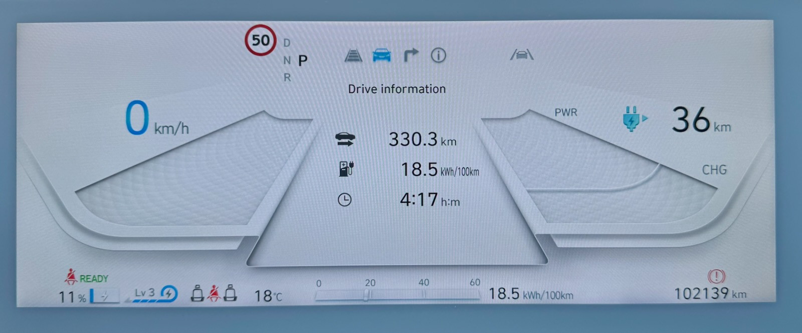 Testul de descărcare l-am efectuat pornind cu bateria încărcată 100% și am parcurs un traseu de 330 km, la finalul căruia am rămas cu 11%. Conform datelor indicate la bord, bateria ar mai putea stoca 68,6 kWh între 0-100%.