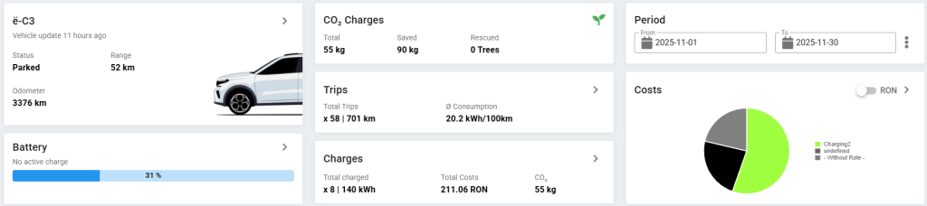 - Distanța parcursă: 503 km (45045 km – 79% SoC)
