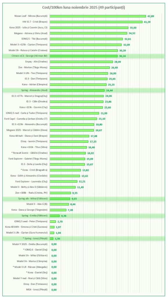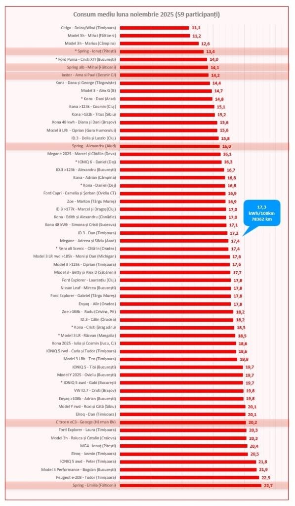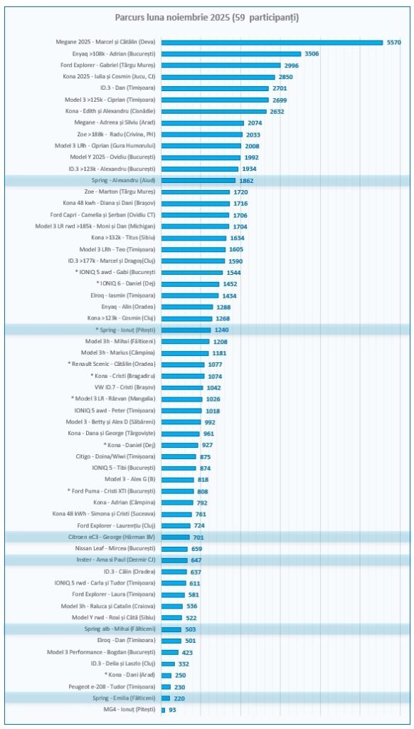 Noul Renault 5 parcat de Radu (Crivina, PH) în garajul nostru virtual va fi inclus în bilanțul de final de an, dar nu era drept să omitem sublinierea din clasamentul înmatriculărilor BEV pentru primele 11 luni, alcătuit de Tudor (Peugeot e-208, Timișoara), alături de colegele de echipă: Spring, Inster și e-C3.