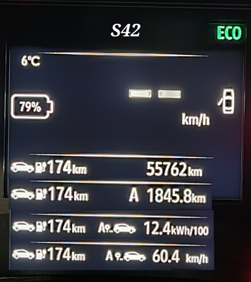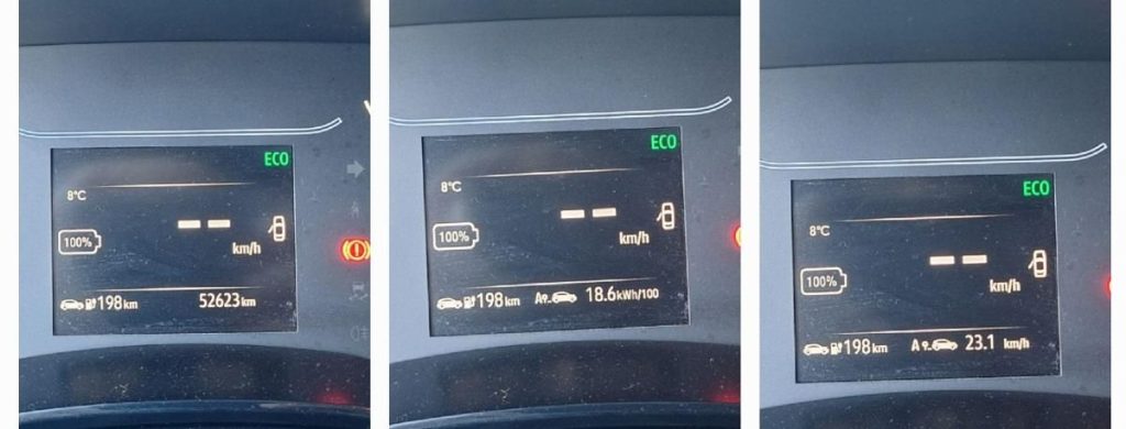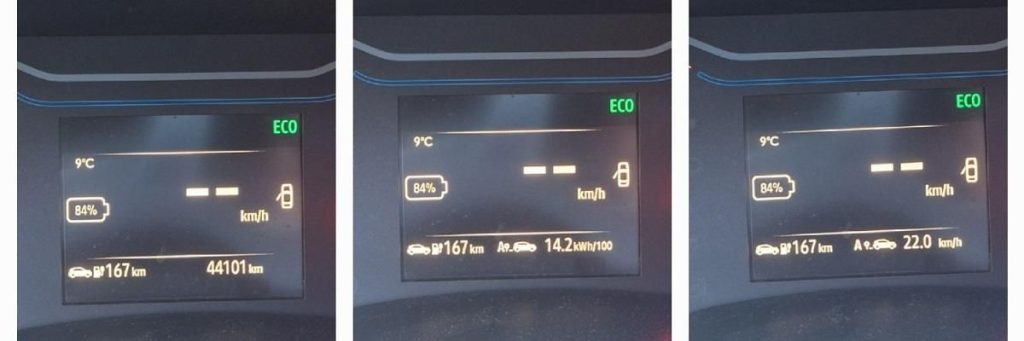 Nu sunt sigur de ce a fost atât de mare consumul. Ce am observat totuși, ieri, Duminică: am avut 100% bateria, am plecat la cumpărături, climatizarea pe auto la 21 grade. Am parcurs 16 km iar consumul pe acest drum a fost 22 kWh/100 km, ajungând acasă cu 92%. Se pare că mereu primii 10-15% din baterie scad cel mai repede (sau s-a simțit frigul, 5-6 grad afară).