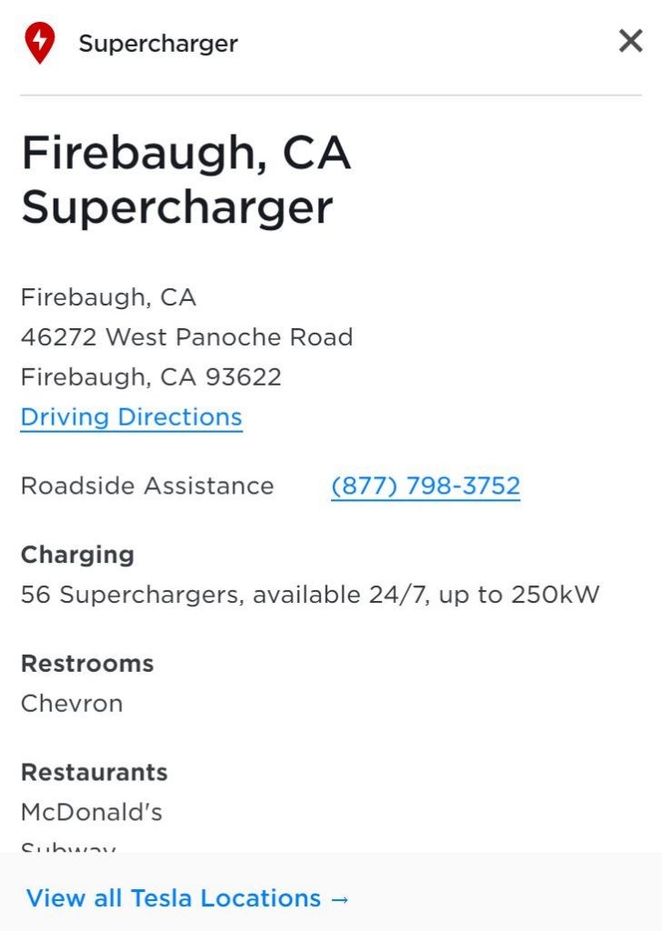 În prezent cea mai mare stație Tesla Super Charger este la Shanghai și are 72 puncte de încărcare (max. 120 kW). În Firebaugh, California, sunt disponibile 56 de puncte de încărcare din generația a treia (max. 250 kW).