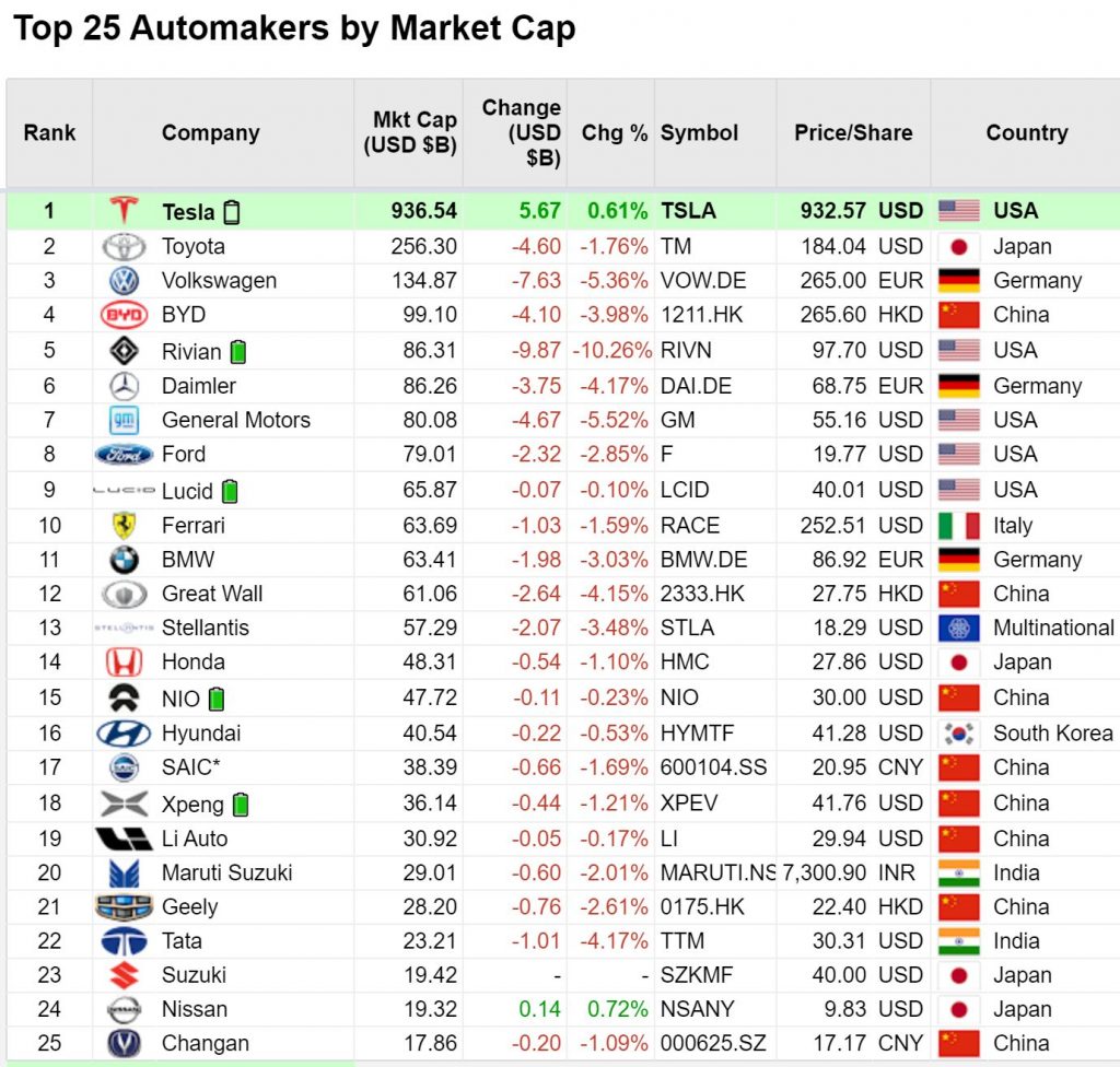 Pe lângă finanțarea guvernamentală, tot mai mulți investitori mari sunt interesați de oportunitățile generate de electromobilitate. Încotro se îndreaptă fondurile investitorilor este ușor de văzut din clasamentul primelor 25 de companii auto, după valoarea actuală la bursă.