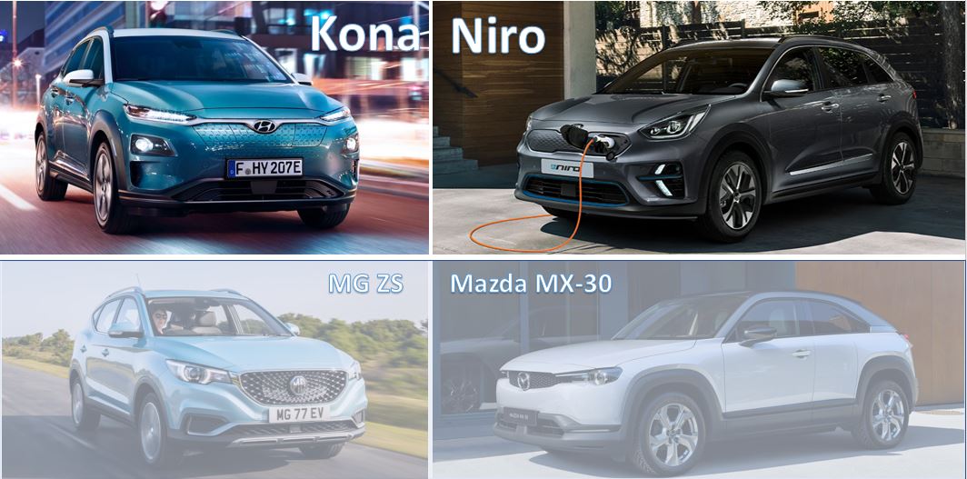 Pe scurt, este vorba de patru produse ale grupului corean Hyundai-Kia, care se bazeaza pe doua caroserii, denumite Kona si Niro si pe doua grupuri motopropulsoare de 100 kW si 150 kW, in combinatie cu un acumulator „mic” de 42 kWh si o varianta „mare” de 64 kWh la Kona si 67 kWh la Niro.