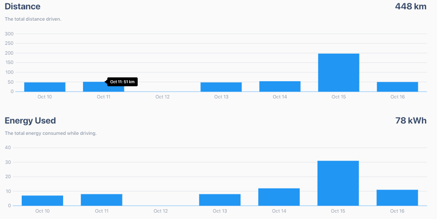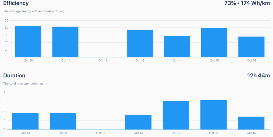 Atașez și raportul săptămânii din Teslamate, ca de obicei fiind simțitor mai mare pentru că include și consumul staționar (17kWh in plus!):