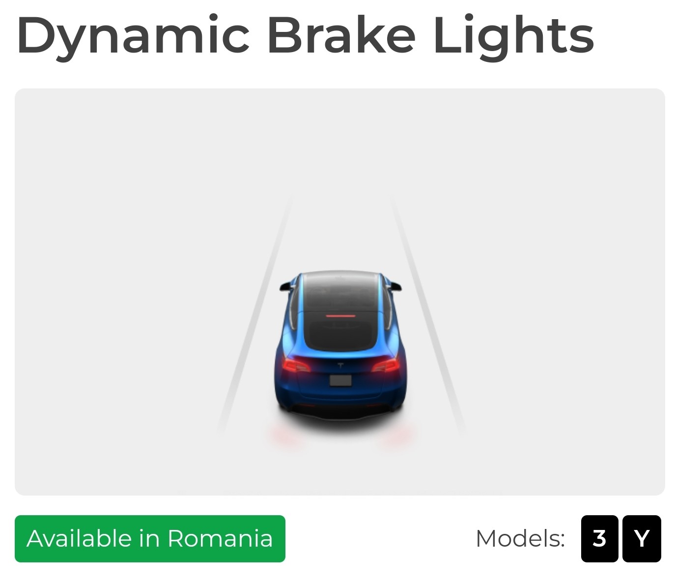 Dacă conduceți cu peste 50 km/h și frânați puternic, luminile de frână vor clipi acum rapid, pentru a-i avertiza pe ceilalți șoferi că mașina dumneavoastră încetinește rapid. Dacă mașina dvs. se oprește complet, luminile de avarie vor clipi până când apăsați accelerația sau apăsați manual butonul luminilor de avarie pentru a le stinge. Funcție disponibilă doar pentru Model 3 și Model Y.