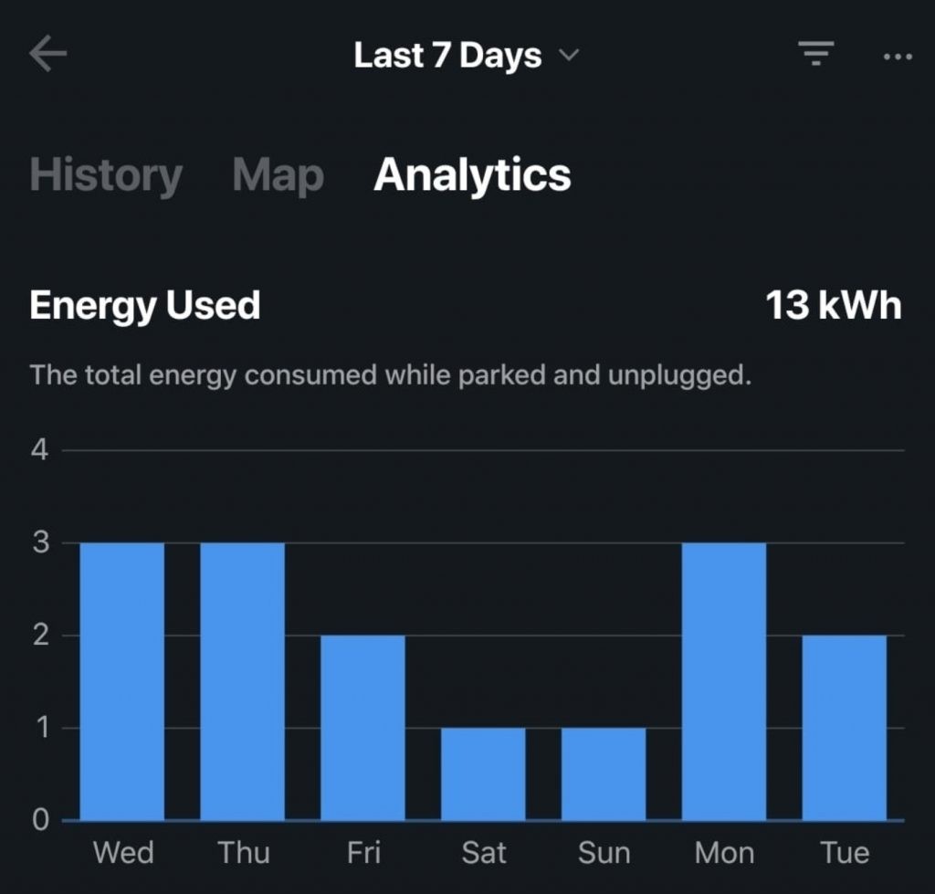 După o săptămână de mers doar prin oraș, cu sentry mode pornit (minim 8 ore/zi, luni-vineri) și precondiționare în fiecare dimineață, situația energiei consumate în staționare arată astfel: