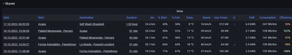 În ultimul tab (Efficiency), vedem valori mai bune decât cea Rated (137Wh/km), cu excepțtia primei linii care este de luni dimineațaă (trafic aglomerat + washing mode activat la spălătorie).