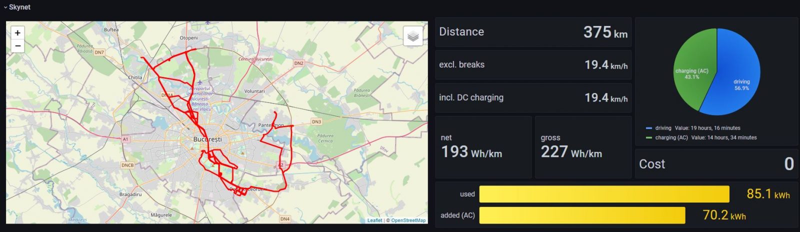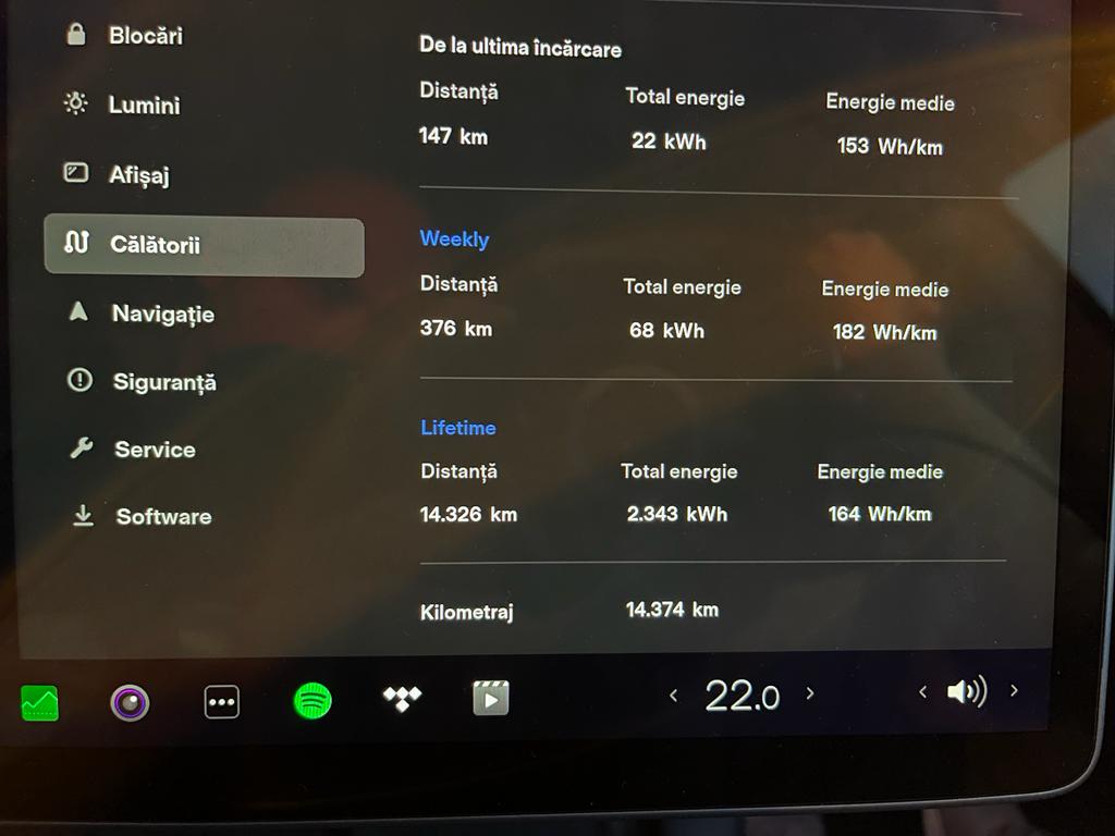 Consumul mediu ar fi trebuit să fie cu mult peste 20 kWh/100km, dar în weekend am făcut câteva plimbări prin oraș dar și în împrejurimi, în stilul lui Bjorn „sunday driving” atingând consumuri mai mult decât ideale, conform Teslamate (3 persoane + 1 copil în mașină):