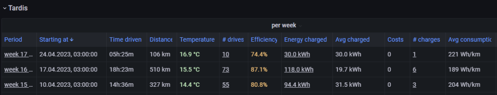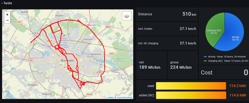 TeslaMate raportează un consum ceva mai mare – 18,9 kWh/100km și 114 kWh consumați.