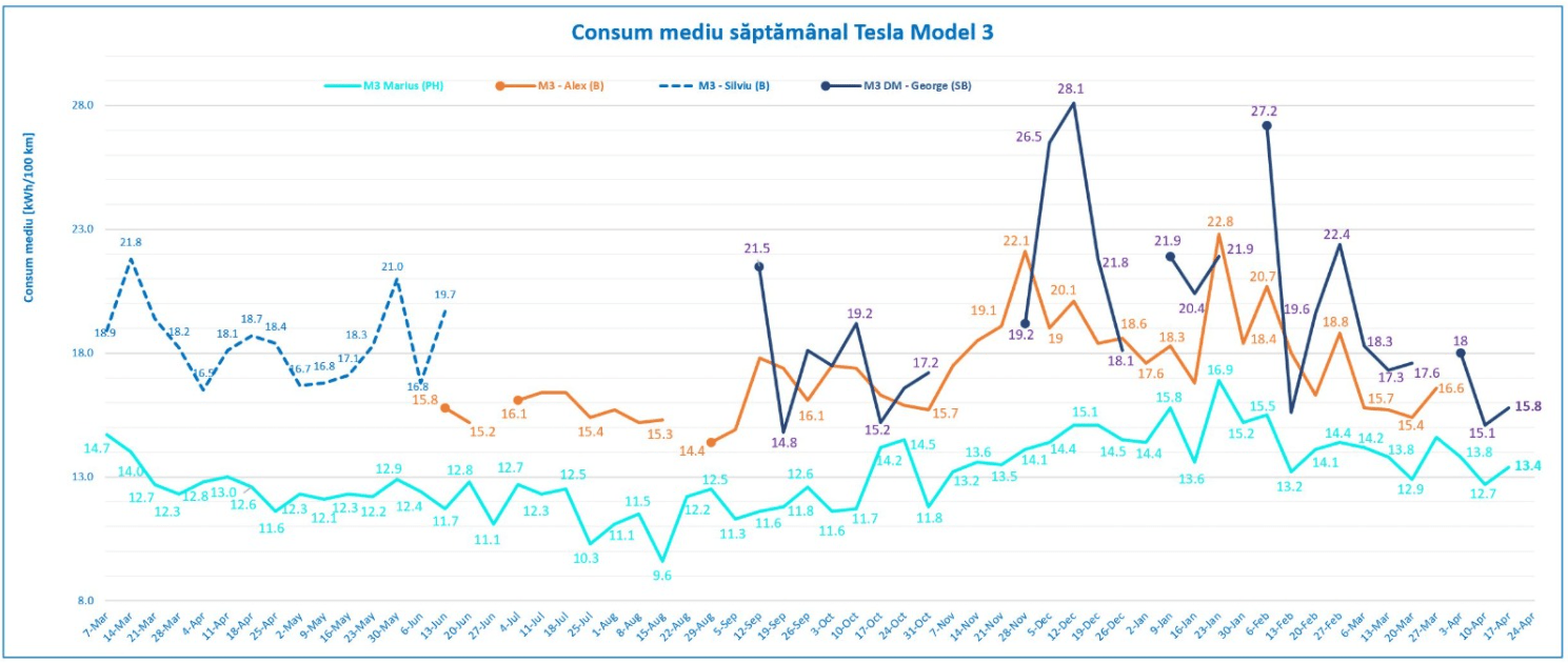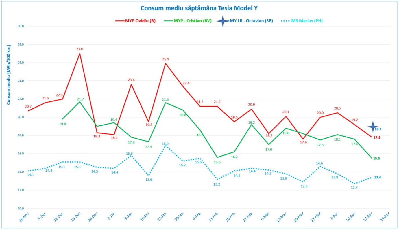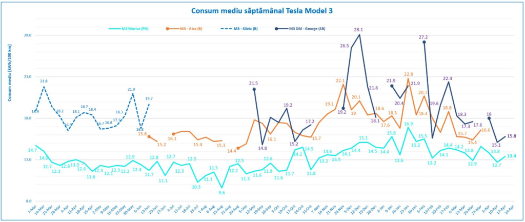În graficul de consum mediu pentru Model Y, am atașat și M3-ul SR al lui Marius (Câmpina) pentru cei interesați de o comparație Model 3 – Model Y.