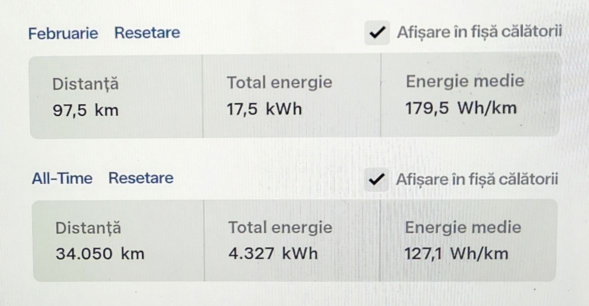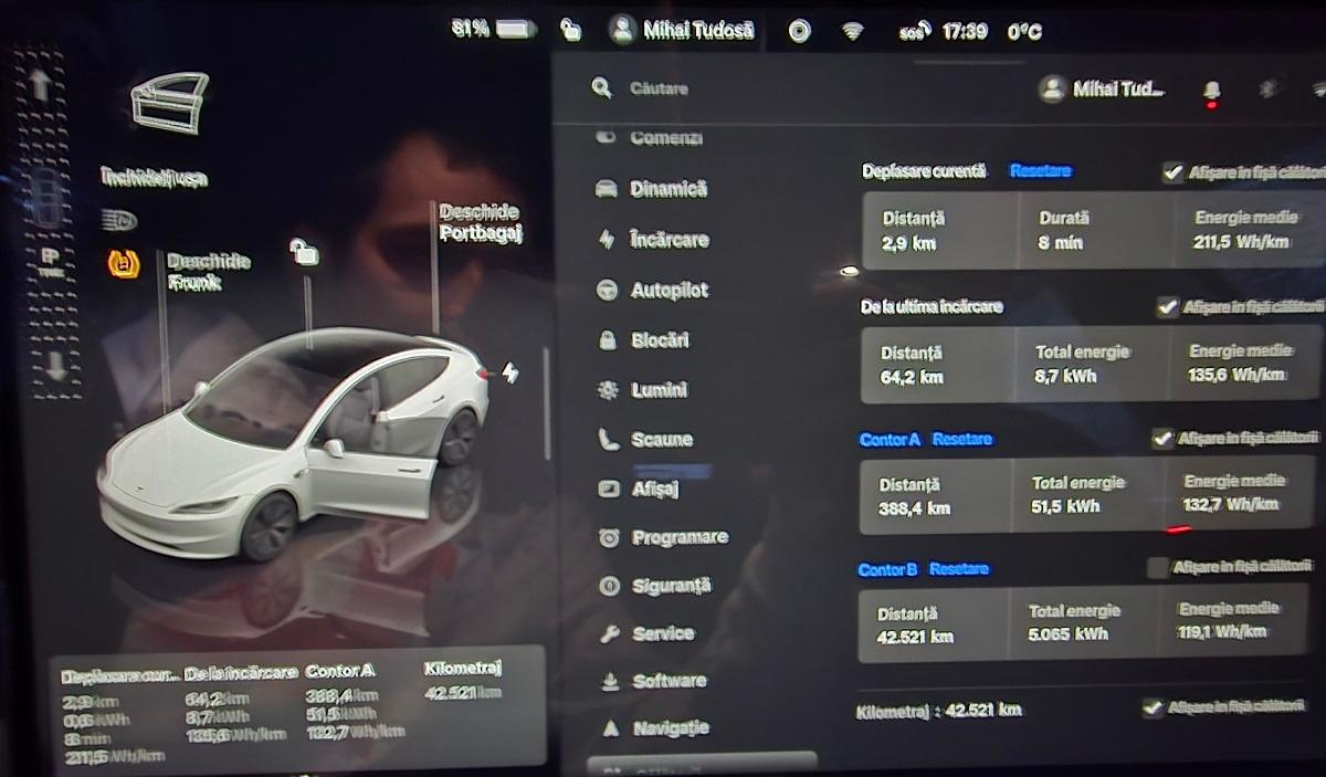 - Energie consumată în Park: 19.31 kWh (Precondiționare, Vehicul în așteptare, Ecran, Sentry 56 de ore)