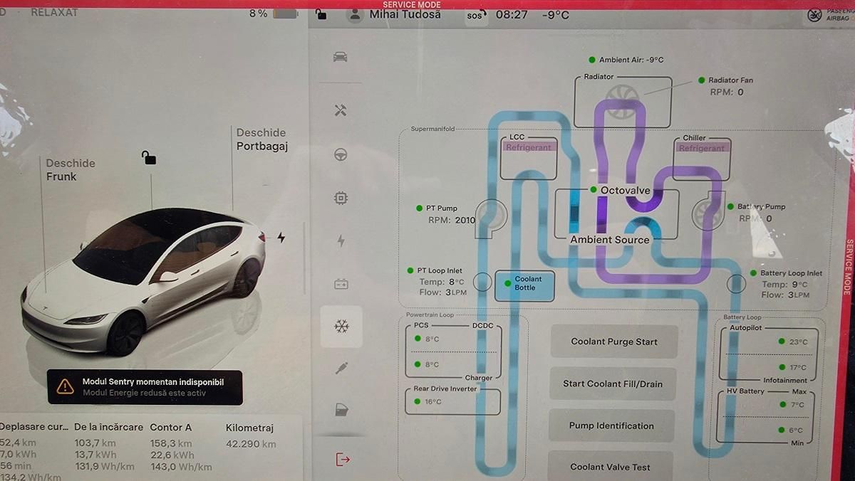 Fiind temperaturi cu mult sub 0 grade, am înregistrat valorile la principalele componente după 60 de minute de mers. Se observă 6-7 grade la bateria de tracțiune, 16 grade la invertorul motorului cu -9 grade Celsius afară. Mașină ținută afară, fără nici o protecție. „No protection”… vorba lui Bjorn.