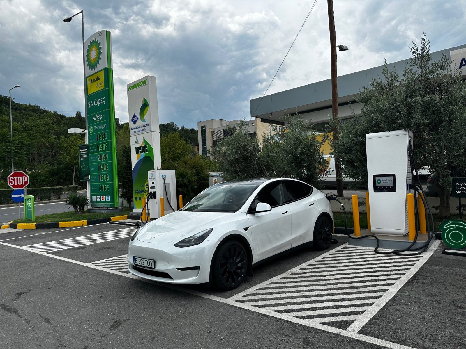 Am ales Veria deoarece există patru conectori cu puteri între 75 și 150 kW într-o benzinărie BP. Foarte ok benzinăria și cel mai drăguț personal care l-am întâlnit în această călătorie. În poza de mai sus se pot vedea două stații, cea din stânga poate oferi maxim 75 kW, iar cea din dreapta până la 150 kW. Atenție aici, sunt doi conectori diferiți, unul de 150 kW și unul de 75 kW. Uitați-vă la cabluri și alegeți-l pe cel mai gros. Aici am avut 2 sesiuni încărcare, de 6 respectiv 14 minute, stația mare fiind inițial ocupată de un coleg bulgar. Prețul este de 0.65 euro/kWh.