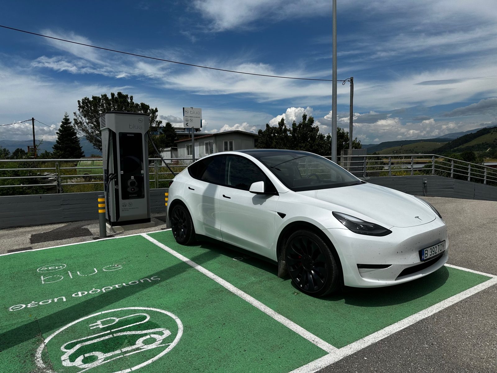 Stația de la Neokesaria este în curtea unei reprezentanțe VW, cu nicio facilitate în apropiere. Am avut și aici ghinionul să ne întâlnim cu colegul din Bulgaria de mai devreme, încărcând câteva minute cu o putere de 90 kW. Se folosește aplicația DEI Blue, iar prețul este de 0.62 euro/kWh. Am încărcat și aici mai mult decât era necesar pentru a avea un SoC confortabil la destinație.
