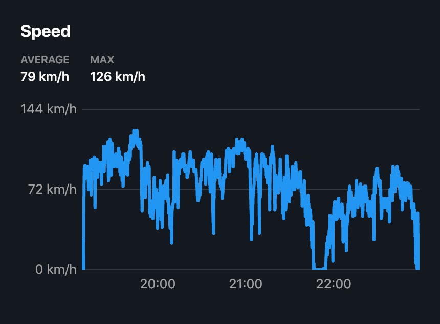 Lungul drum spre casă a însemnat 1.311 km, conducând 16h 58min și încărcând 2h 25min. Consumul mediu a fost de 18,5 kWh/100 km. Durata totală, condus, încărcări și pauze a fost de 20h 7min, excluzând faptul că am dormit peste noapte la București.