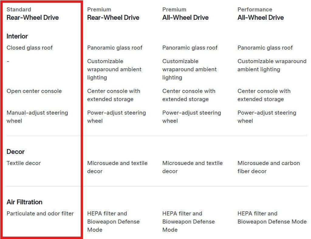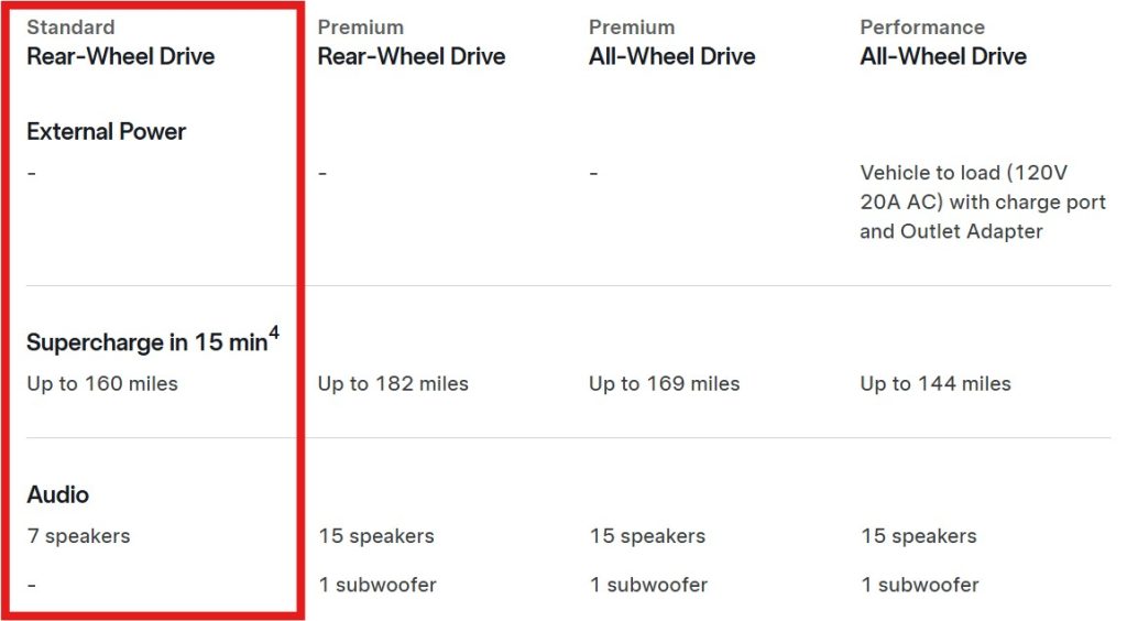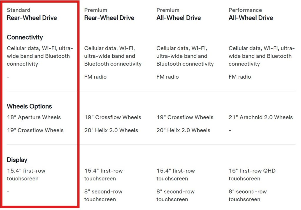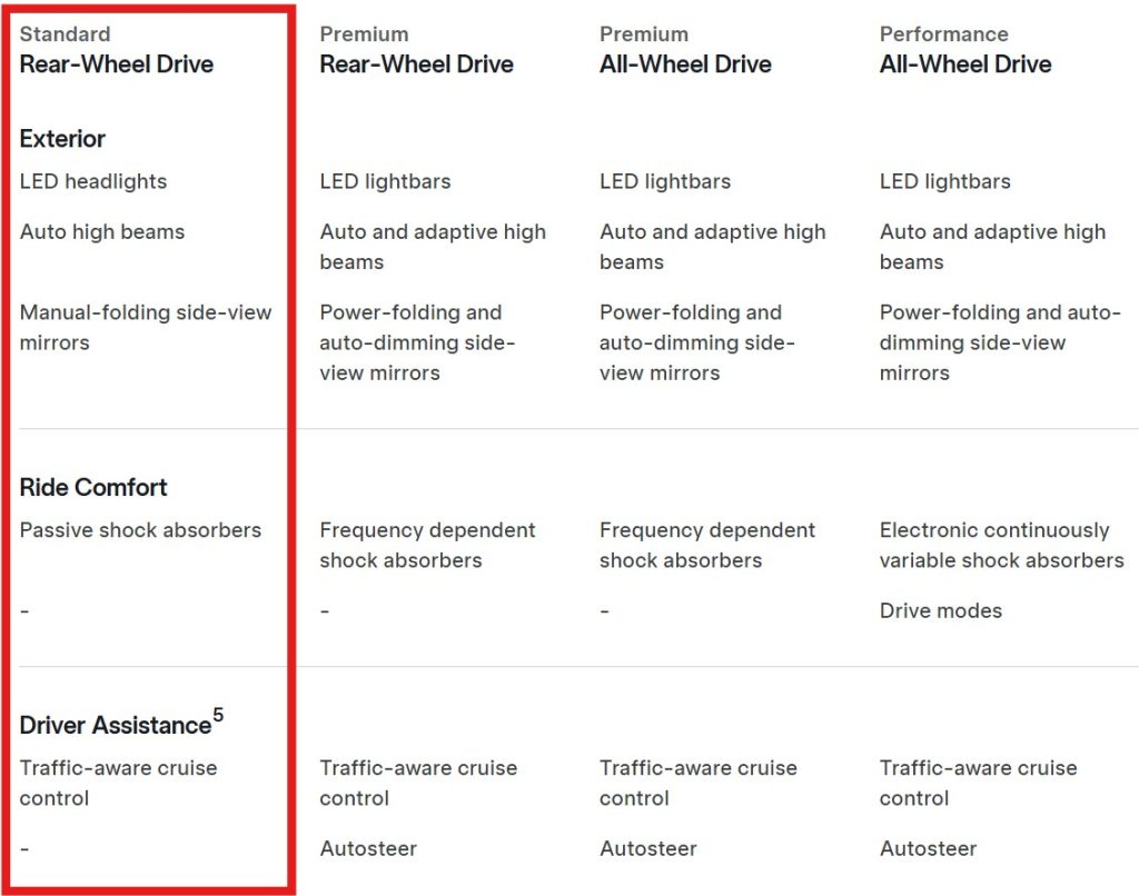 Alte diferențe, mai ascunse, le-am marcat pe lista comparativă oferită de Tesla pe pagina Model Y-compare.