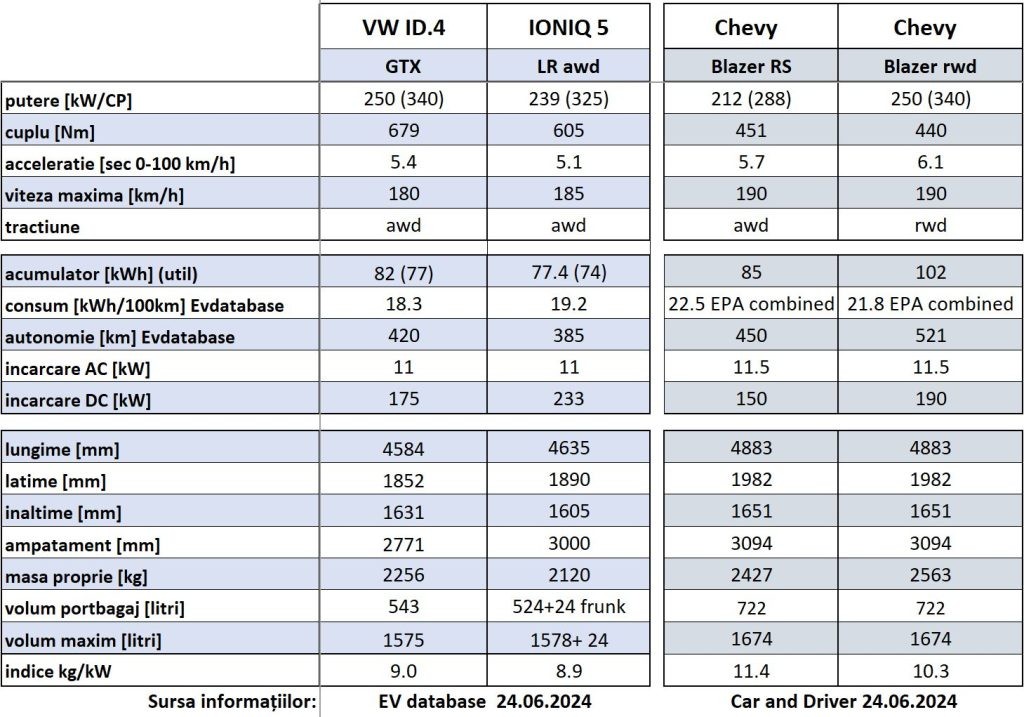 Pentru specificațiile tehnice o sursă bună a fost revista Car and Driver, căutările vagi ale dealerului pe pagina Chevrolet soldându-se fără rezultate concrete. Cu această ocazie am actualizat și performanțele pentru ID.4 GTX și IONIQ 5 awd conform EVdatabase.