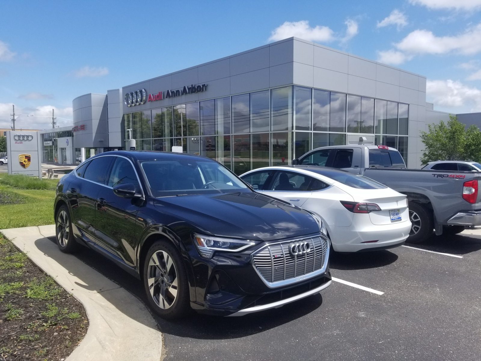Programarea pentru test drive în orașul universitar din apropierea Detroit-ului, nu a decurs conform așteptărilor foarte ridicate de la un dealer premium, mașina plecând la ora stabilită chiar de sub nasul nostru cu un alt grup de clienți interesați. Ni s-a oferit la schimb un alt e-tron, dar curiozitatea fiind pentru varianta Sportback, am preferat să așteptăm, timp utilizat pentru mai multe imagini cu detalii.