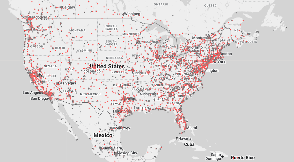 - Find us Tesla pentru harta punctelor de incarcare din America de Nord – filtre aplicate: Supercharger și destination charger