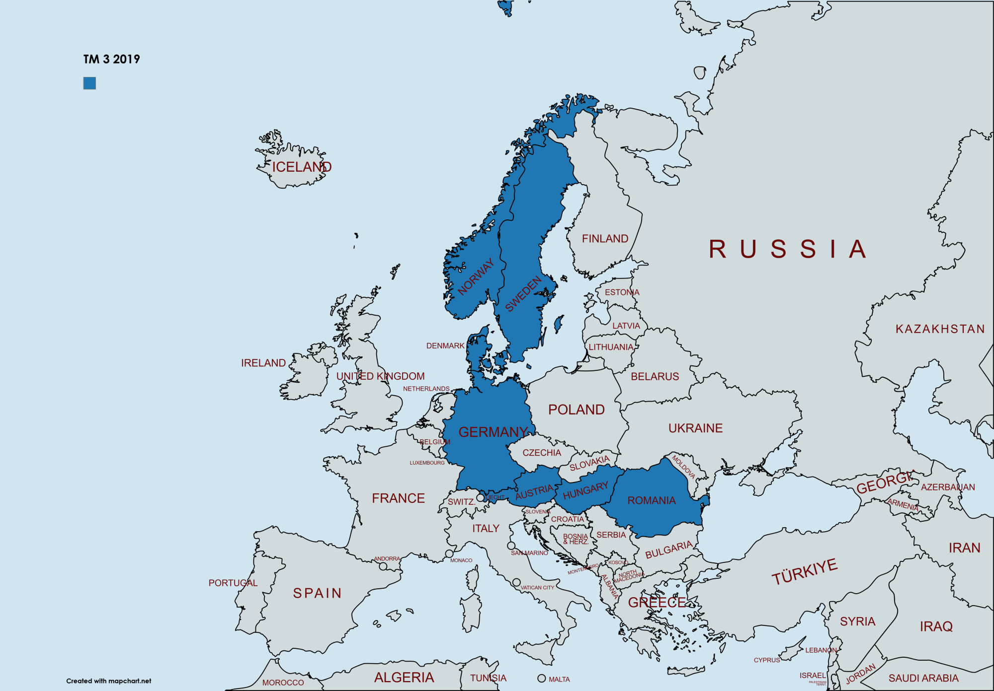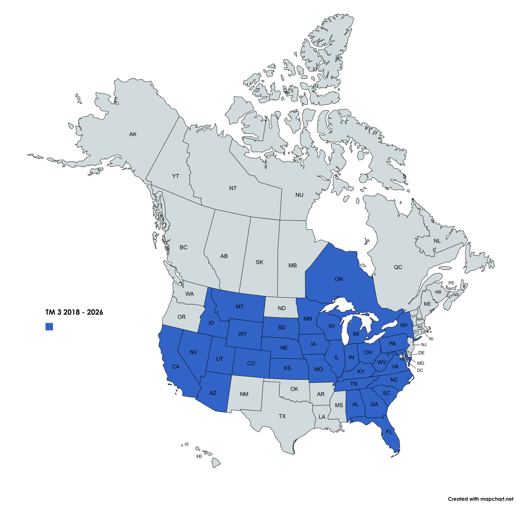 Începând de la 1 noiembrie 2018, TM 3 a vizitat următoarele țări europene și state nord-americane: