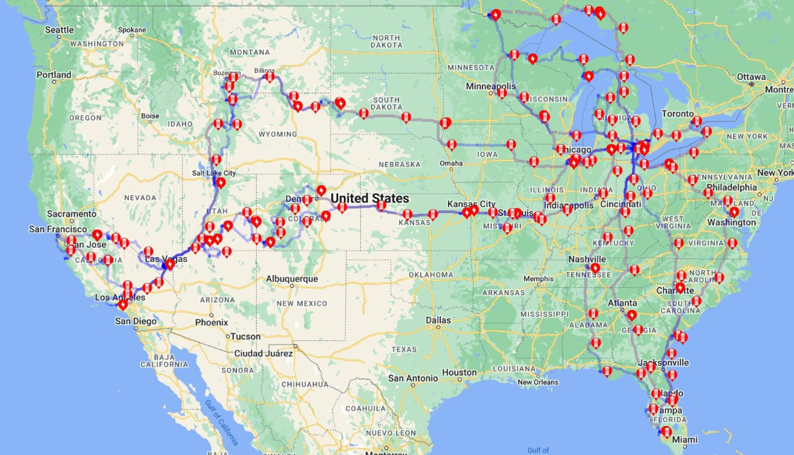 O imagine mai precisă a traseului nord american, care include și punctele de încărcare, am obținut cu ajutorul aplicației TeslaFi.