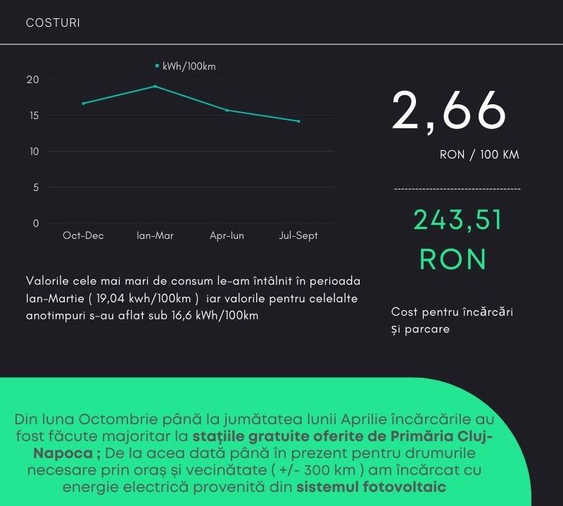 Într-o idee mai colorată mai jos sunt expuse în galerie câteva date cu privire la cât am parcurs, consum mediu, cât am încărcat precum și costurile legate de încărcare.