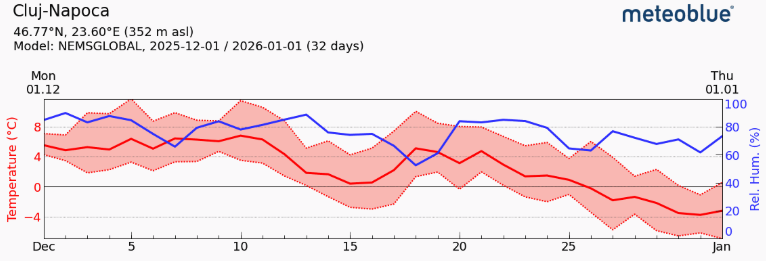Temperaturile acestei luni au progresat precum în graficul preluat de pe meteoblue.com. Trei săptămâni cu temperaturi pozitive în general, scăderi în domeniul negativ pe finalul de an.