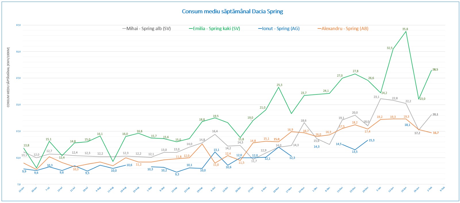 - consum mediu: 16.7 kwh/100 km pentru o viteză medie de 59.9 km/h