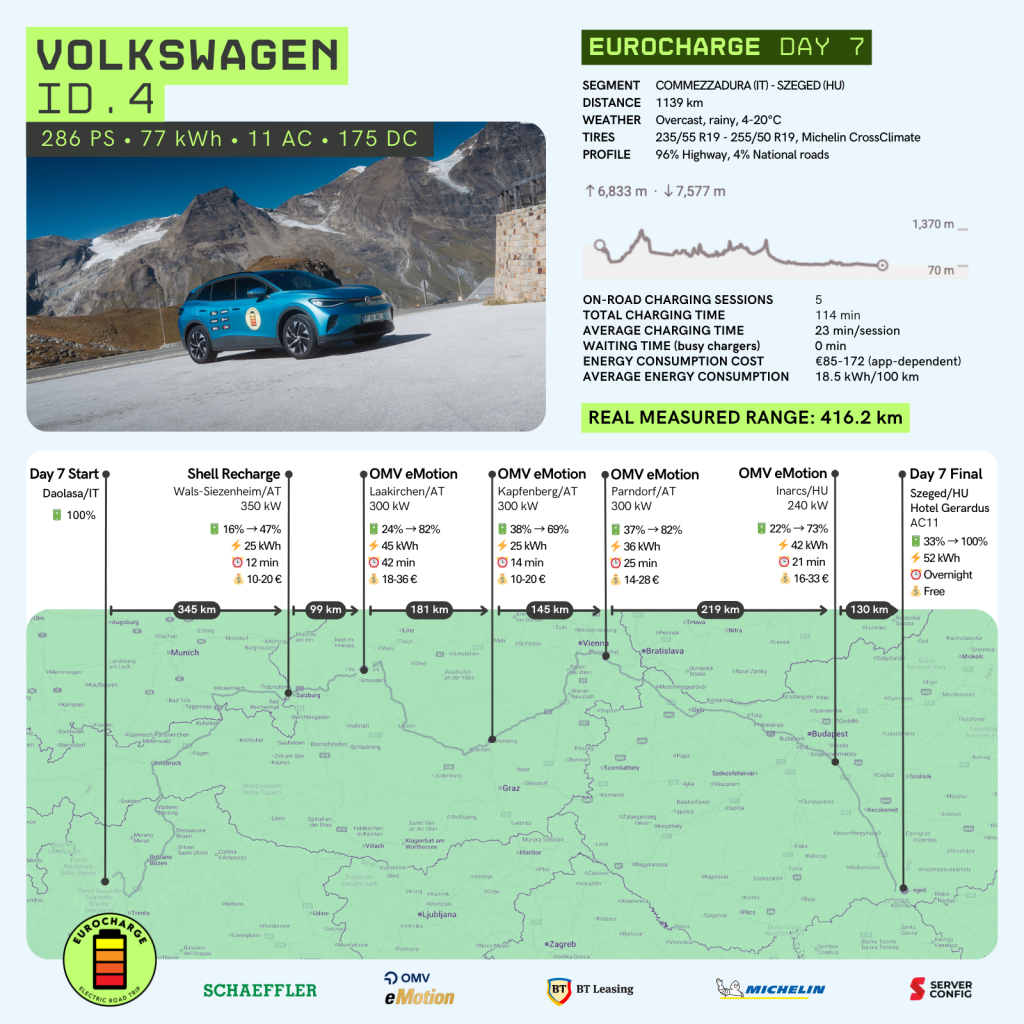 În Eurocharge 2025 am condus mașina pe traseul Commezzadura (IT)–Szeged (HU), pe vreme ploioasă și 5-20 °C, pe un traseu format predominant din autostrăzi (96%). La finalul zilei datele de pe bord au arătat 1.139 km, cu un consum mediu de 18.5 kWh/100km. Asta se traduce într-o autonomie reală de peste 400 km, o valoare foarte bună pentru autostradă.