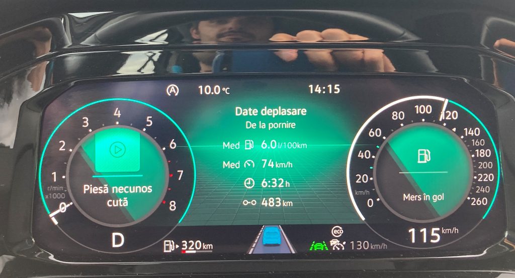 Consumul afișat la Golf a fost de 6 l/100 km pe vreo 560 km de mers domol, ploaie pe 50% din drum, în rest nori, vreme închisă și asfaltul ud pe mare parte din drum și cu ceva autostradă, unde am mers cu 120-140 km/h conform limitelor din Bulgaria. Având în vedere motorul mic de 1 litru și 110 CP, depășirile le-am făcut în forță, cu accelerația la podea, ca să am cuplul maxim la dispoziție. O să verific când alimentez care este consumul real la pompă, mai am vreo 250 km range și nu e nicio grabă să alimentez.