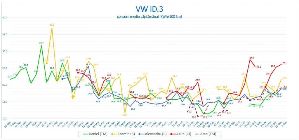Valorile consumului mediu săptămânal încep să se ridice dincolo de 20 kWh/100 km, cunoscute de anul trecut din informațiile transmise de Daniel, și chiar peste, în cazul drumurilor scurte parcurse de Călin la facultate.