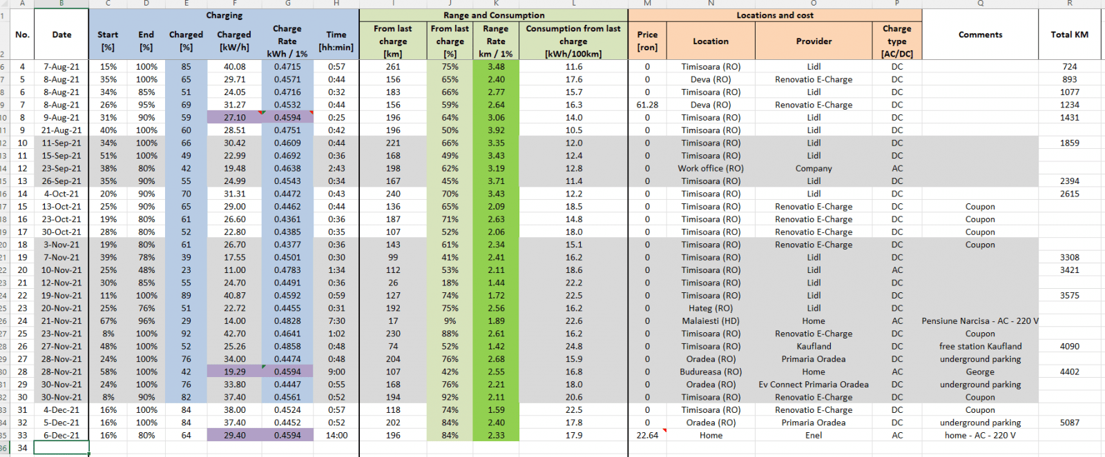 ** Zona albastră: Pentru situațiile în care nu știu exact cât am încărcat (stație ce nu mi-a afișat, sau nu am apucat să fac poza, încărcări casnice fără monitorizare, etc), folosesc media încărcării rezultată pentru 1% baterie – aici cred că o să aduc un update să folosesc media pe luna respectivă. (deocamdată e media tuturor încărcărilor cu total cunoscut).