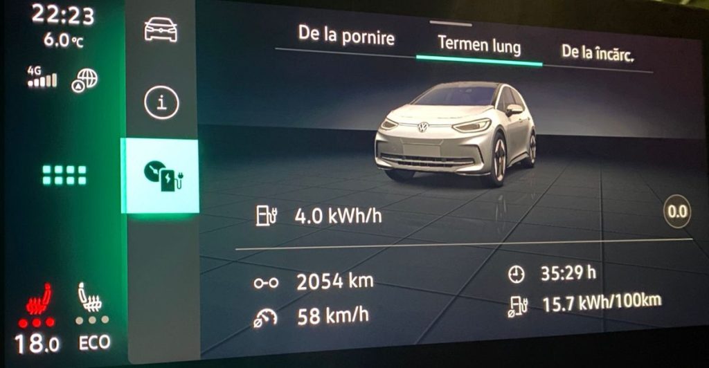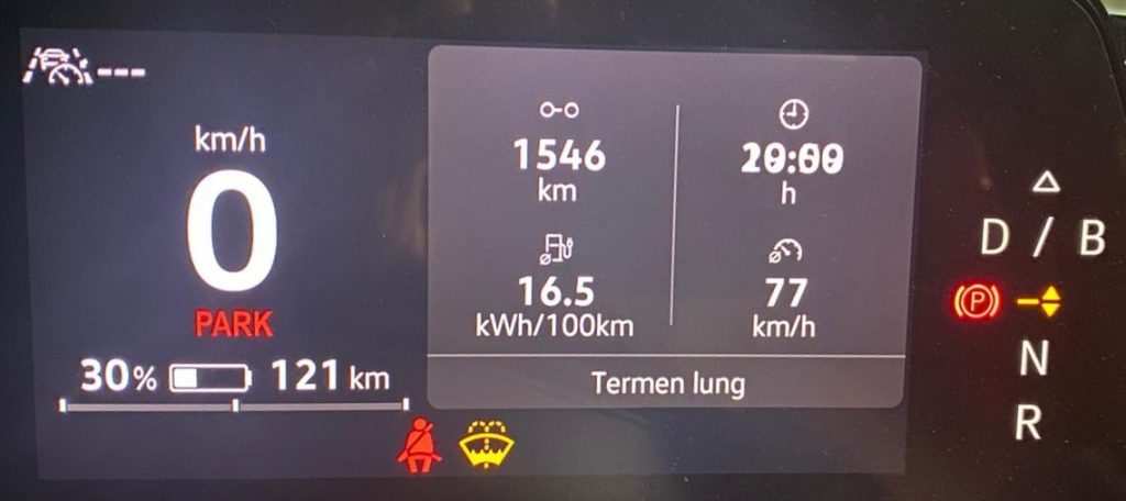 – Consum în bord: 15,7 kWh/100 km (include și zilele astea brrrrr! – încălzire în scaun, volan, AC pe 18 grade)