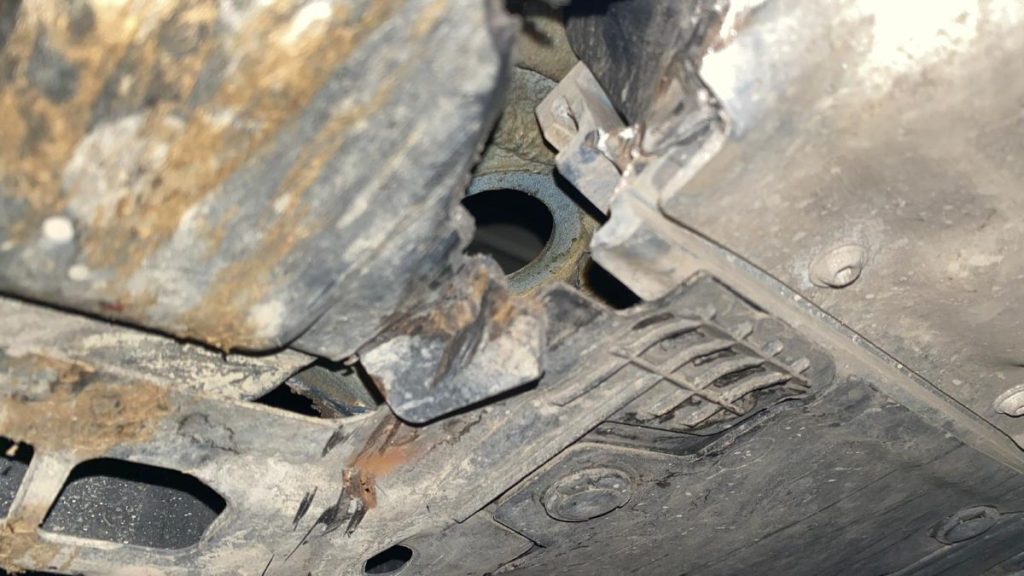 La final, „the fun stuff”. Revenind de la mare, a trebuit să-l culeg pe băiatul meu de la Vivo. Am ajuns tocmai la închidere și, când am încercat să ieșim din parcare, am trecut peste un capac de rigolă (da, din acelea multe care stau să cadă în rigole) pe mediana drumului. Acesta s-a ridicat, s-a întors pe sub mașină și a rupt plasticul acoperitorului de prag cu un zgomot care tindea să sune ca o bombă. Viteza era de 5 km/h, practic stăteam pe loc.