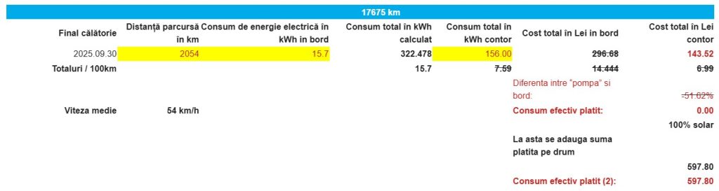 Dacă NU aveam panouri, aș fi încărcat 143,52 lei acasă pentru 156 kWh pe contor pentru 508 km. Asta însemna 28 lei/100 km. (Din păcate, nu e 100% acest consum, pentru că am folosit priza mașinii și la alte cele.)