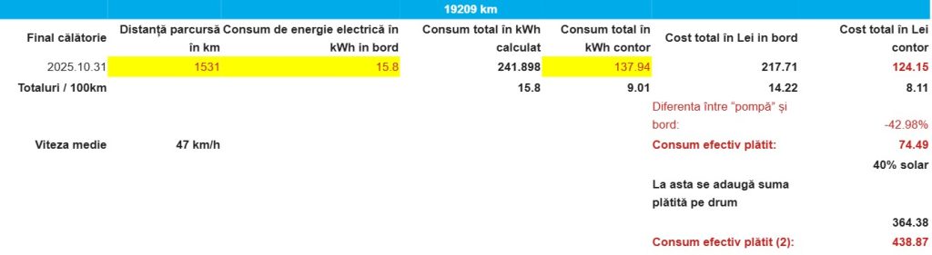 Dacă nu luăm în considerare cei 14%, care au fost încărcați ca să egalizăm bateria (SOC pornire vs. SOC sosire) am putea spune că am cheltuit 35.3 lei/100km, respectiv 15.2 kWh/100km, ceea ce sună foarte bine având in vedere temperatura de afară dimineața (4 grade).
