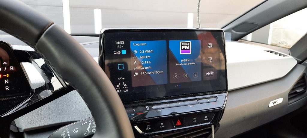 Consumul, distanța, viteza medie: 17.5kWh, 680km, 54km/h.