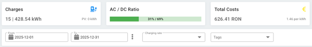 - Încărcări: 250.68 kWh, (6xAC-116,6 kWh, 5xDC-134.08 kWh)