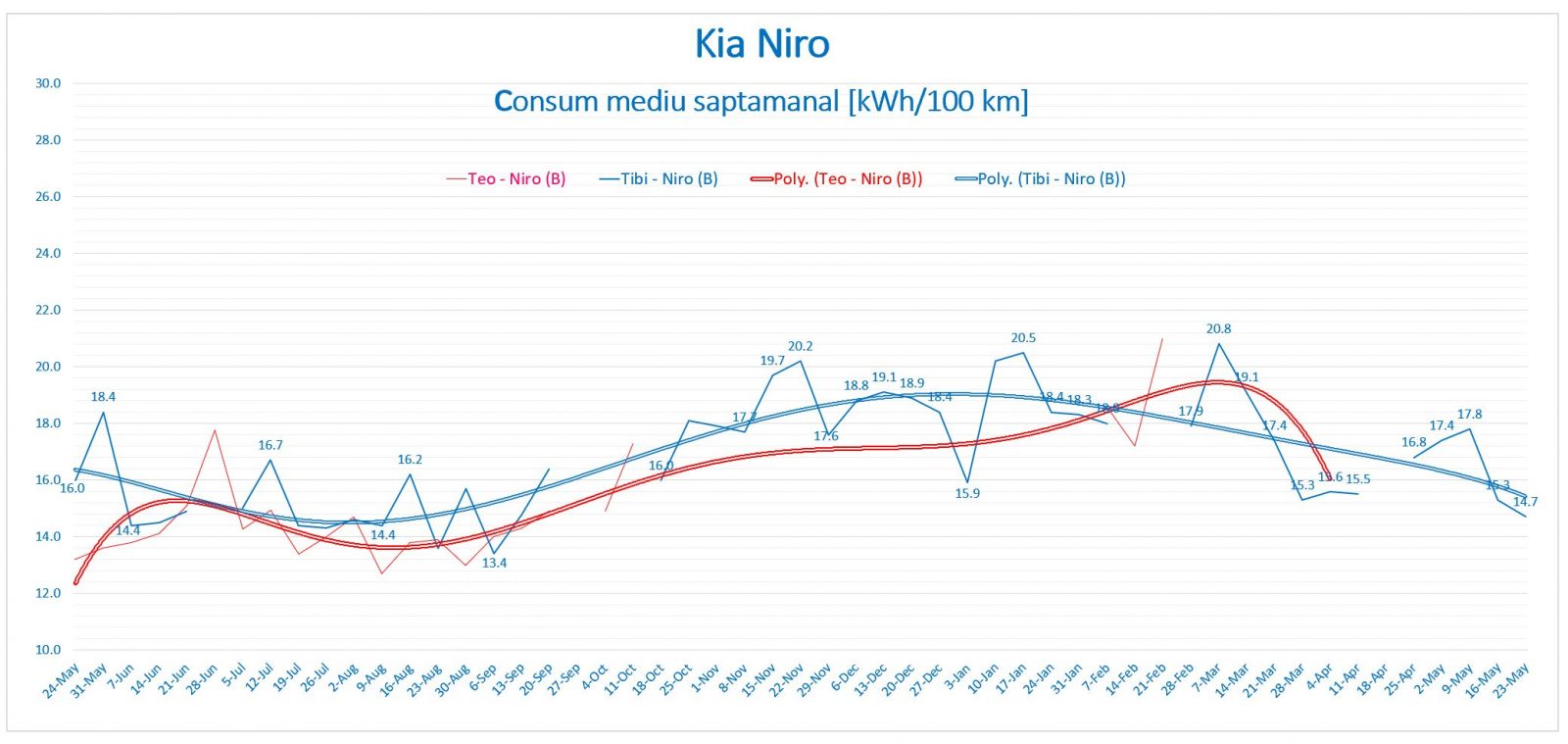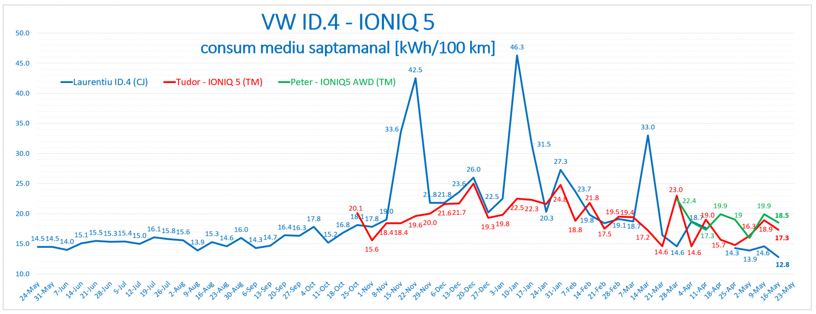 Analizând curba consumului mediu săptămânal obținut de Tibi în acest sfârșit de primăvară, valorile sunt apropiate de cele realizate de Laurențiu cu ID.4 în zona Clujului și de echipa Kona. Ca urmare, un avertisment amatorilor de EV 6. Fiind bazat pe platforma E-GMP și cu performanțe asemănătoare cu IONIQ 5, consumul și autonomia noului EV 6 vor fi mai apropiate de valorile realizate de Tudor și Peter cu IONIQ 5, decât de Teo și Tibi cu Niro.