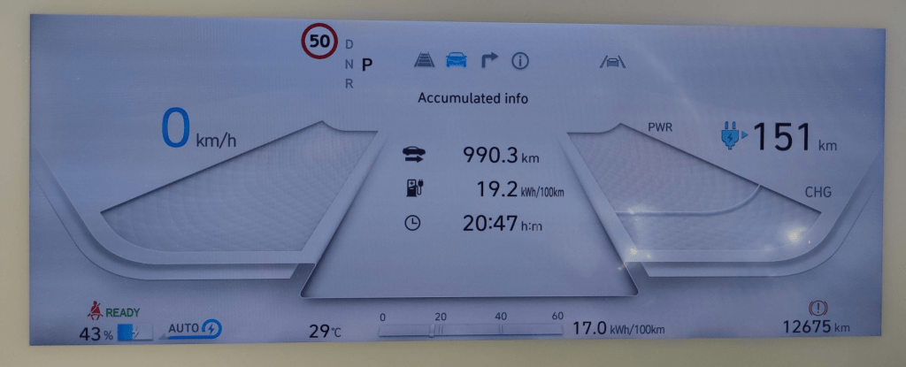 După încă câțiva zeci de km, am dat din nou piept cu aglomerația din Florești (unde am făcut și un mic ocol, care se observă în diferențele de km la dus și la întors) și Cluj-Napoca, consumul final fiind nemaiîntâlnit pentru mine, iar bateria afișa 46% încărcare.