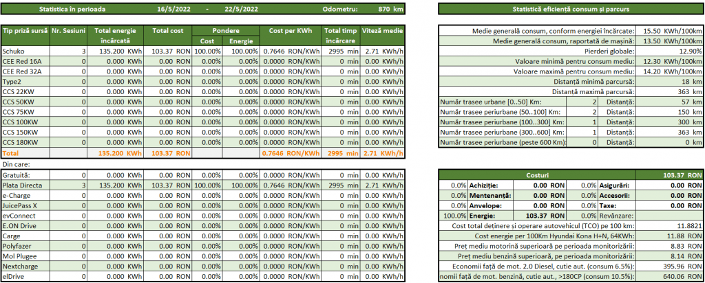 NOTĂ: Dacă tabelul lui Tudor vi se pare detaliat, am adăugat o mostră cu dashboard-ul lui Andrei (Kona cu peste 100.000 km, Brașov), ca dovadă a pasiunii și timpului investit în colectarea și transmiterea informațiilor de proprietarii voluntari participanți la proiectul Electromobilitate.