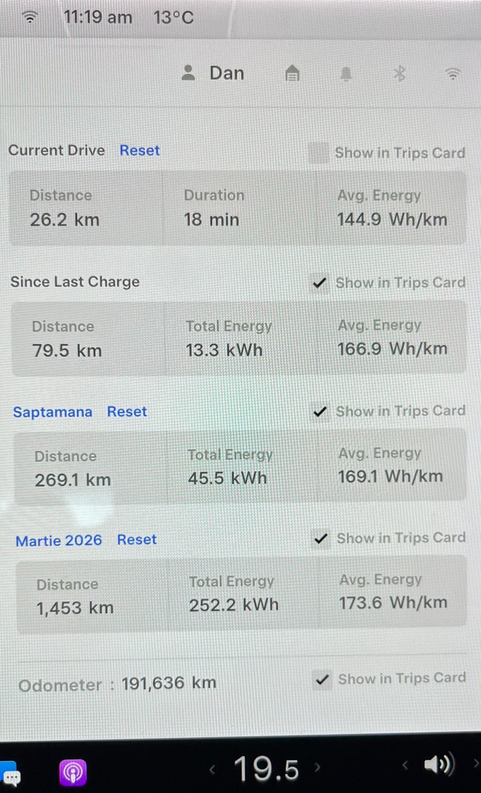 Dar nu-i chiar rău, dacă ne uitam la ultimul drum de la încărcare, aproape 80 km cu un consum mediu 16,7 kWh/100km. Dimineața a fost rece, dar revenirea la aprox. 13o C a rezultat intr-un consum mediu de 14,5 kWh/100km pe ultima etapă de 26 km.