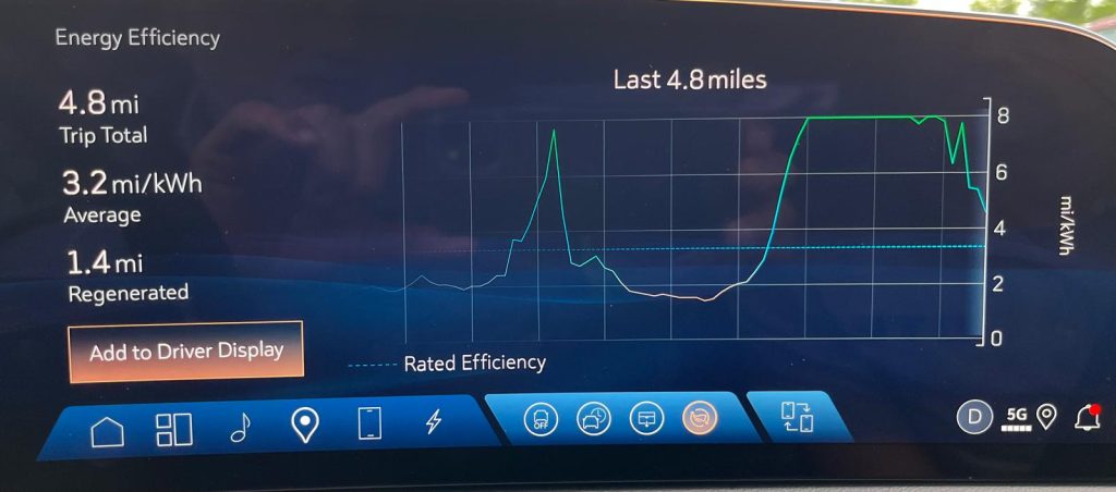 Intuitiv nu-i așa? Albastru putere consumată, verde recuperată. Valoarea consumului mediu aproximativ 2 mile/kWh (imaginea din stânga) înseamnă 31 kWh/100km. Despre valoarea din dreapta mă abțin…