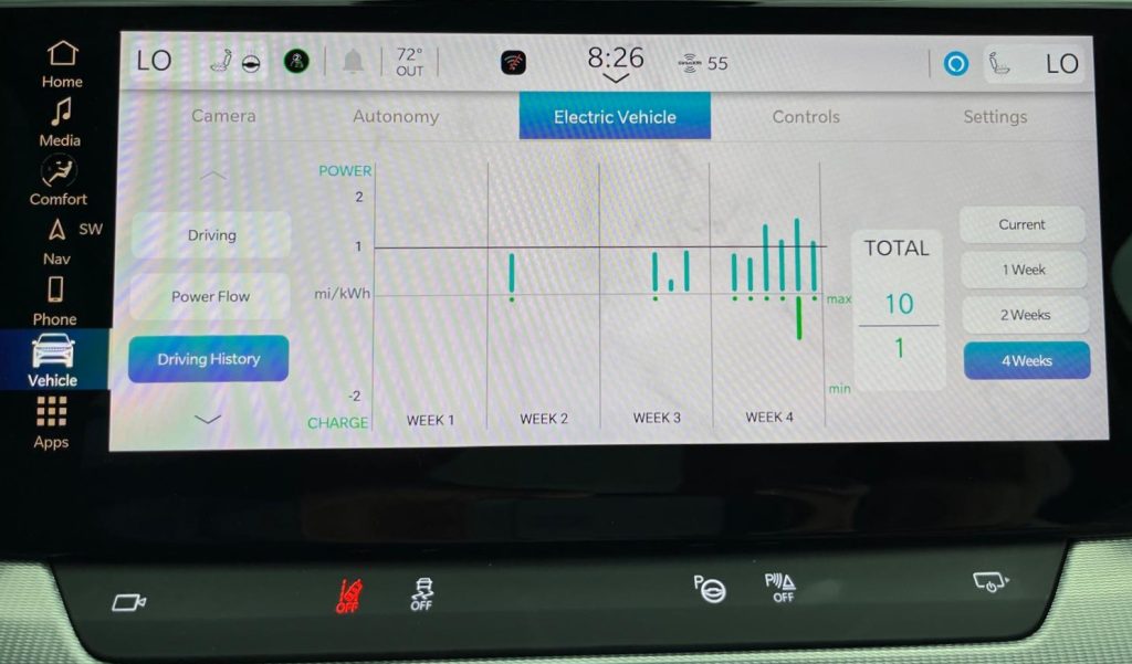 Mai dificil au fost de extras datele despre eficiență, consum, putere consumată în timpul test drive-ului, însoțitorii nostri mirându-se că punem astfel de întrebări, pe care nici ei nu știau unde să le găsească în hățișul de meniuri.